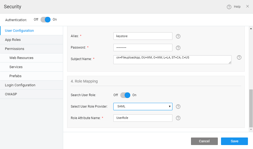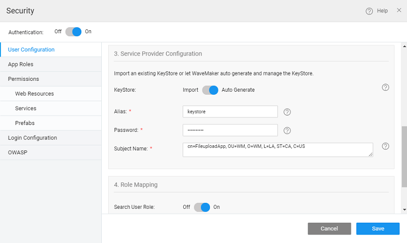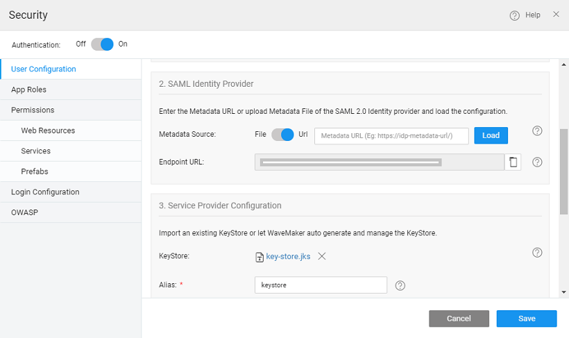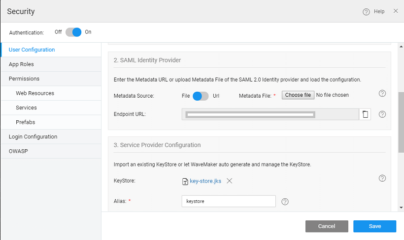 The SAML message exchange requires a public/private key pair for every participating entity in the message exchange. The Idp key pair is maintained by the IdP provider, but the Service Provider’s key pair should be maintained by the service provider, in this case, the WaveMaker application. In most of the production deployments, a valid key pair is recommended to be used, but during application development, WaveMaker helps in auto-generating a key pair for you which should be used only for demo purposes, but not for actual deployment.