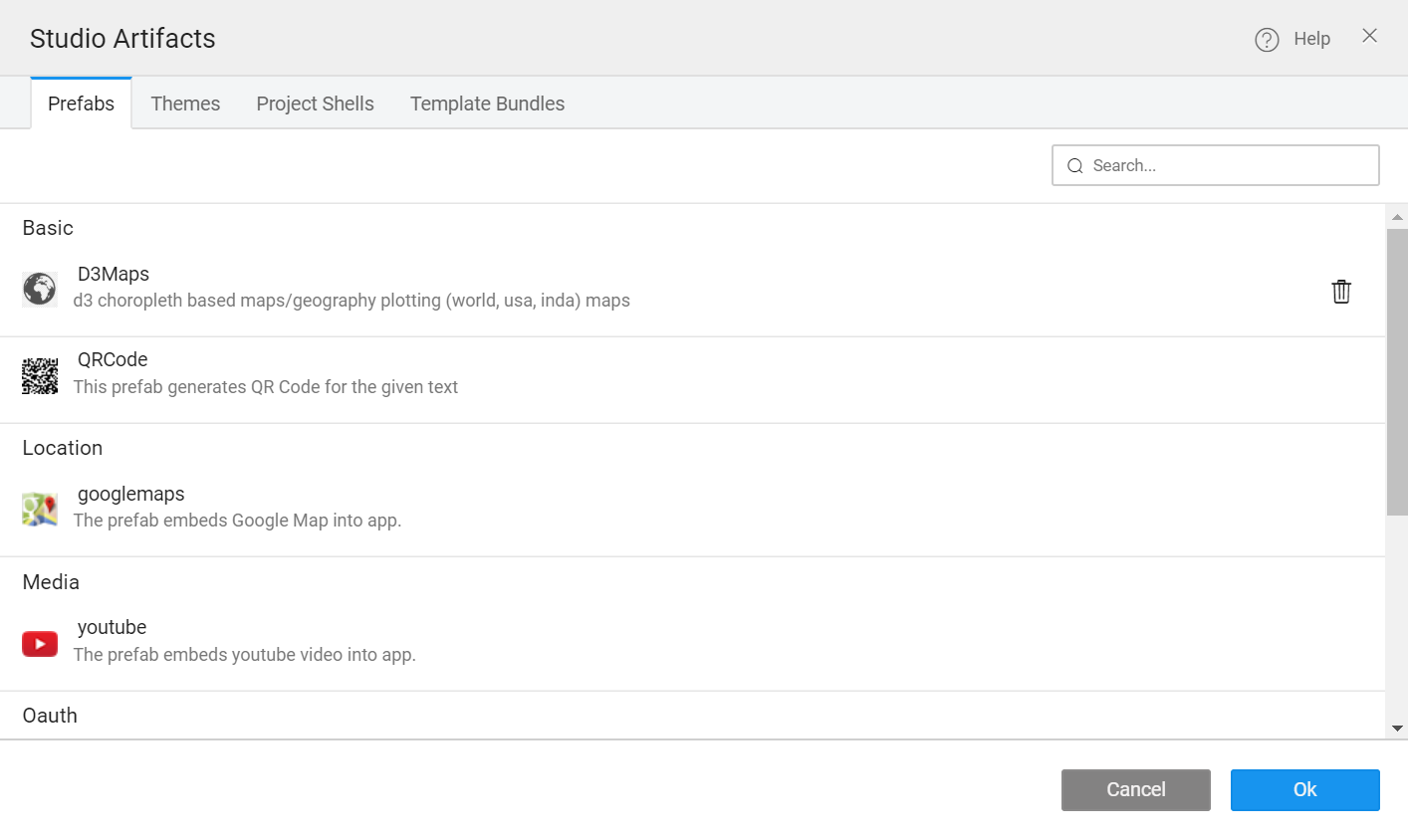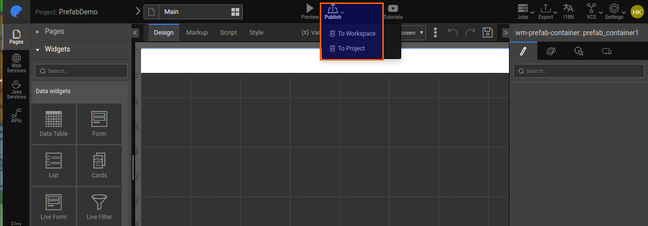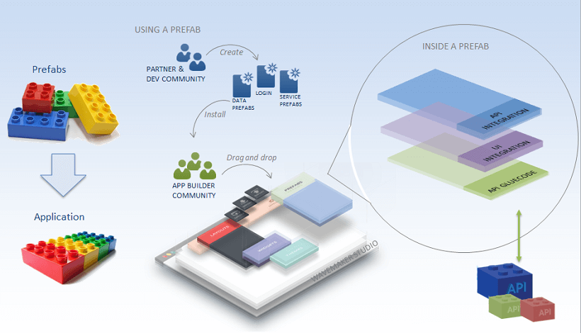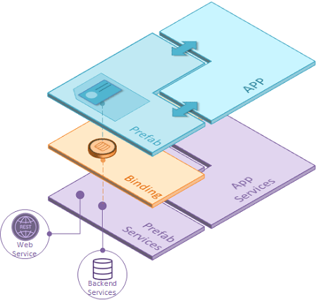 Prefabs leverage all the features available to a WaveMaker app, completely encapsulating them into one reusable component. Their UI Layer is composed of multiple widgets and acts as a single component, which is integrated with corresponding back-end services and they expose events & methods for integration with the enclosing app.
