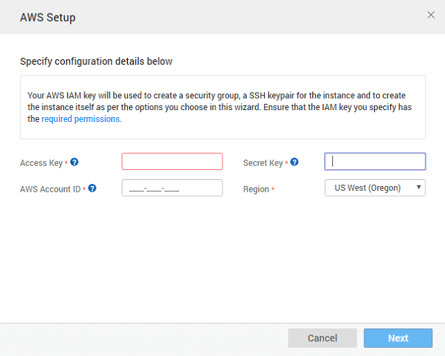 • While setting up the AWS account care should be taken to ensure that the IAM key has the permissions as listed in the configuration dialog. Steps in AWS Configuration: