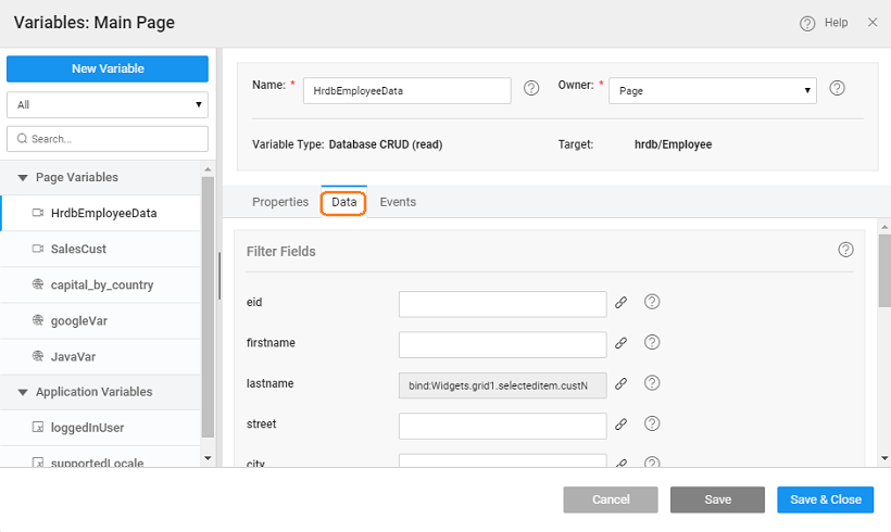 Variables can be bound to each other. Usually, this is the requirement with Variables when the data needs to be filtered i.e. output limited by a constraint or when a Variable which needs parameters as input in order to process information from the data source. These input/filter parameters will be available from the Data tab of the Variable. For example, the Variable corresponding to the Employee CRUD API from the sample hrdb can be filtered on any field of the dataset: