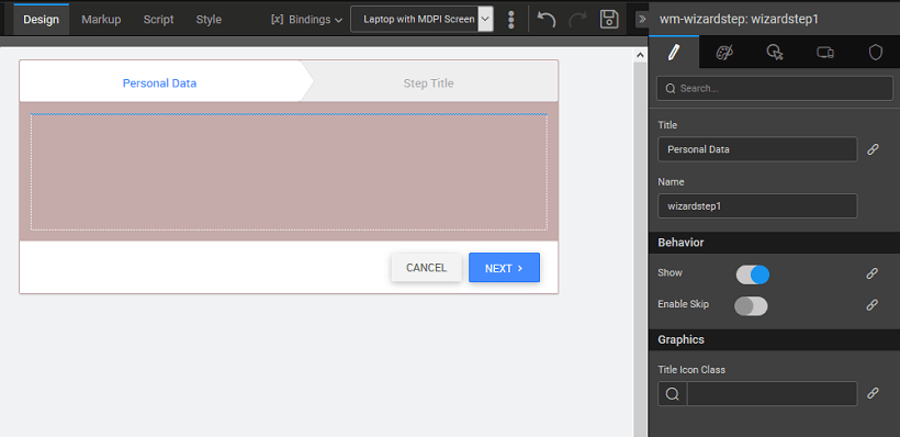• Show: The Wizard step can be shown or hidden by checking it on/off. The step can also be shown or hidden by binding the show property to a boolean field.