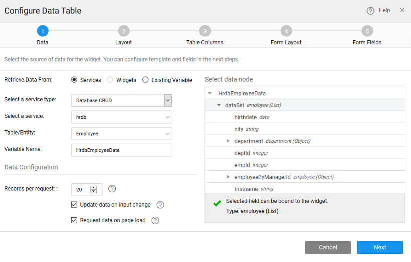 The first step in configuring a data table is to define the data that needs to be displayed. This data can be in the form of Services, Exiting Variable or another Widget.