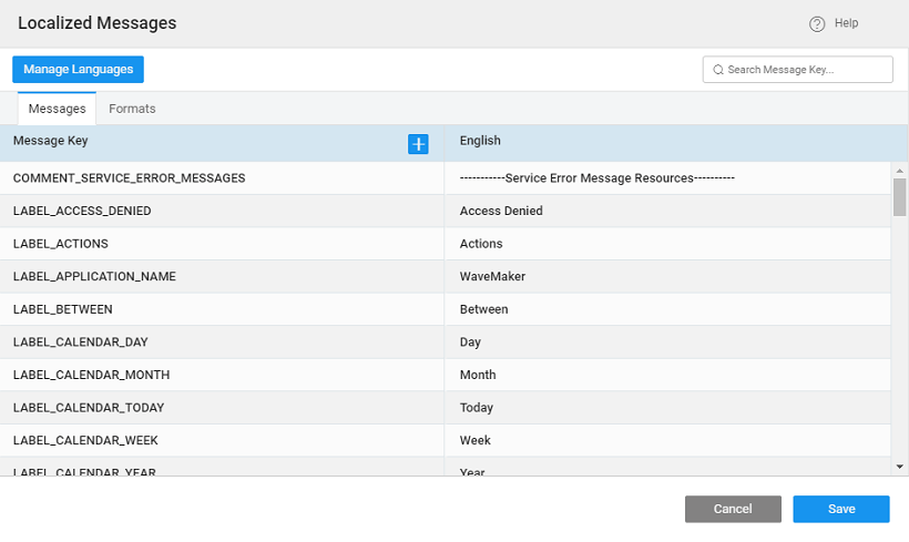 - Localized Messages dialog shows a list of localized text in the current application. The localized text appears as a dictionary of keys and values in different languages.