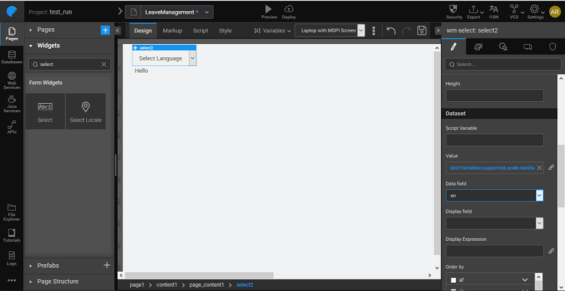 - Drag and drop a Select Locale widget on the project. This widget is bound by default to the