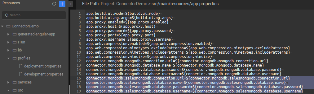 On successful import of Connector into a WaveMaker application, Connector externalizable properties are automatically profiled in the WaveMaker application profiles. The format of the Connector-profiled property is as shown below.