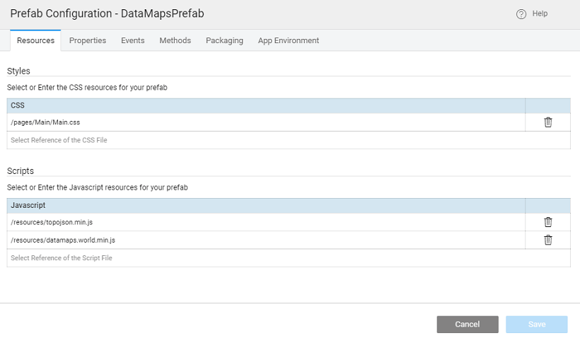 From the Properties tab, set the UI Properties for the Prefab to configure from an app. In this case, you add scope and dataset. For example, scope lets you choose a particular country map, or a world map.