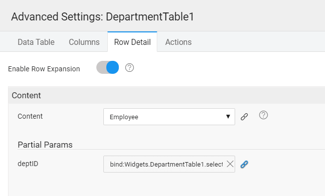 In this article, you will learn how to configure row expansion on a data table. To use the row expansion feature, you create a data table and a partial; you configure the partial to contain related information of the table item. A partial is a semi page which is a reusable object, and a data table is a data widget configured as a variable. You add page params in the partial page and bind it through the data table settings.