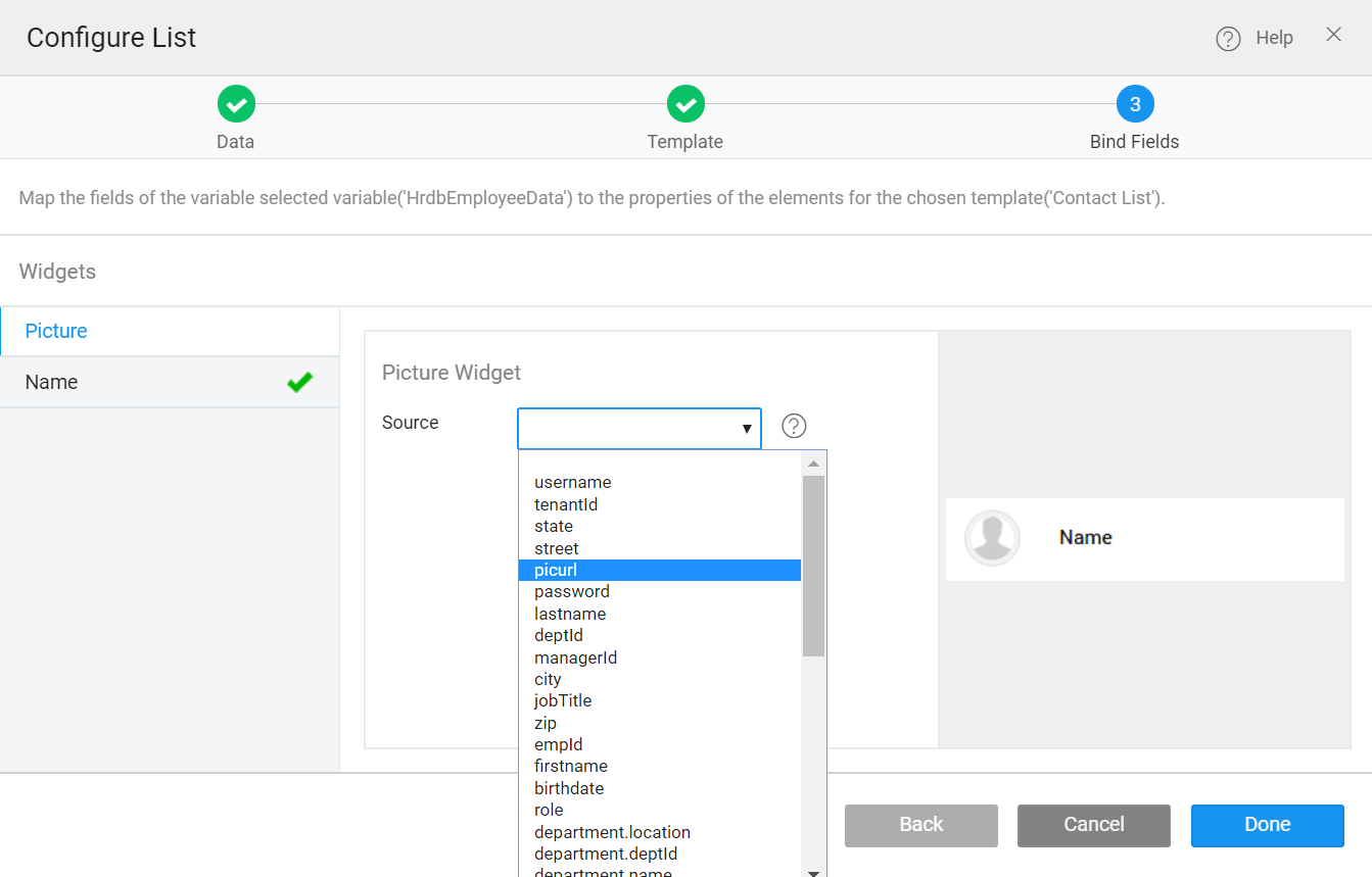 deptID fills with: bind:Widgets.DepartmentTable1.selecteditem.deptId