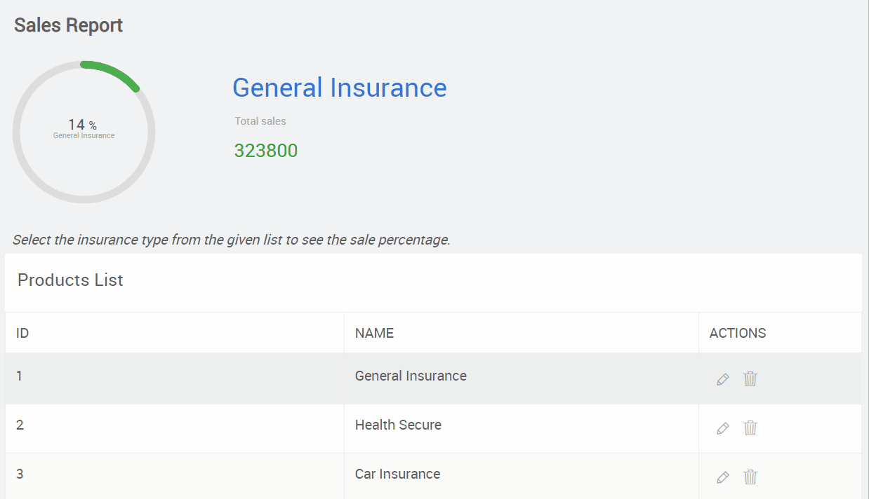 Click the Preview icon to view the page. When you click on each table item, the product sale value displays on the progress circle widget. Also, on the right side of the progress circle, you will see the item name and total sale value.