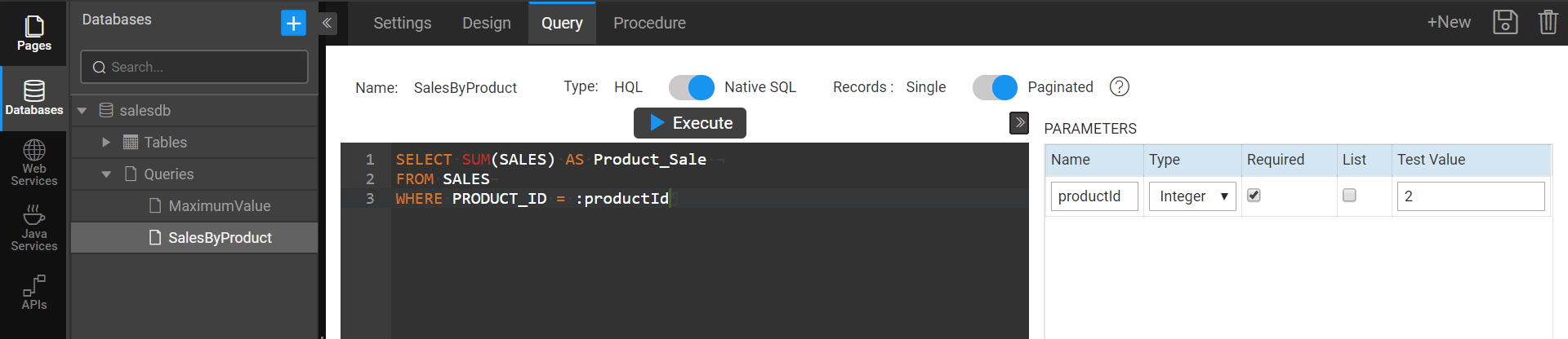 - Click +New. Create another database API to get the total of each product's sale value. For example, write the following lines of code in the query builder to get the sum of total sales for each product: