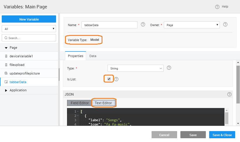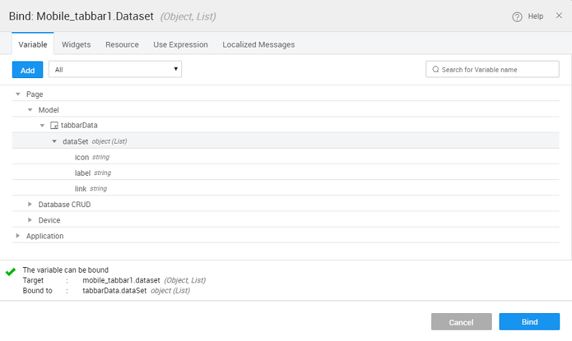 1. Select the tabbar and bind Dataset Value property to the dataset of the Model Variable created earlier.