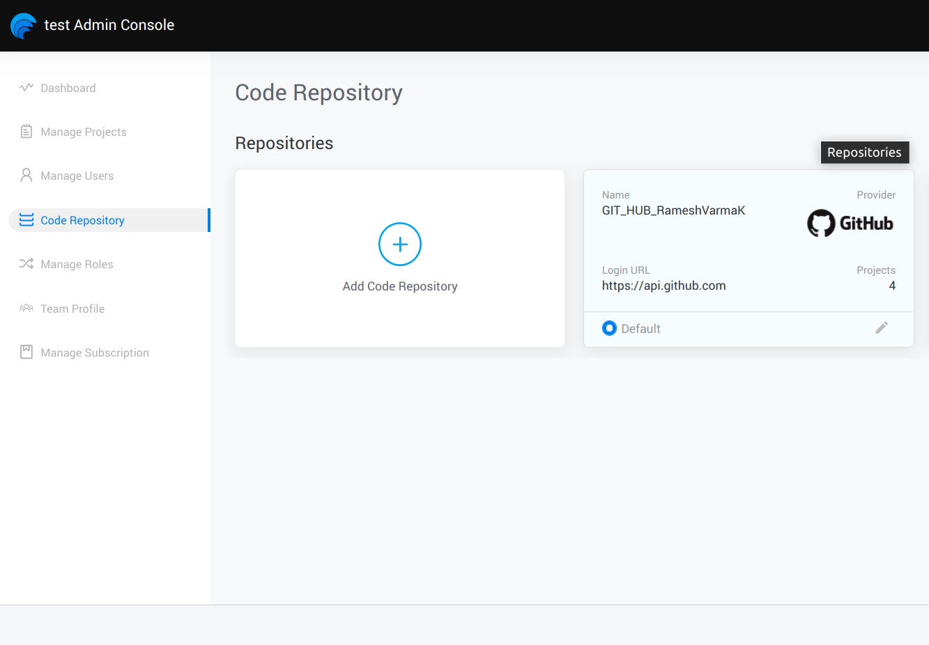 In WMO, the custom VCS integration is available for WMOT plan. During the time of app development in collaborative-development, tracking code changes and synchronizing the changes are essential. WaveMaker provides Version Control Services for this purpose. By default, WaveMaker Studio comes with a version control system that is based on Gitlab. In WMOT, you can integrate your Own VCS as Code Repository. For adding custom VCS in the code repository section, select Add Code Repository.