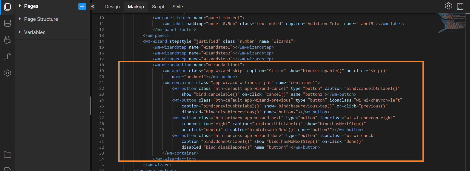 Enhanced customization in the Wizard widget where users can now easily drop widgets into the Wizard's footer section. Earlier, Wizard actions like Next, Previous, and Cancel were fixed. Now, users can configure, style, or add new actions or widgets based on their requirements.